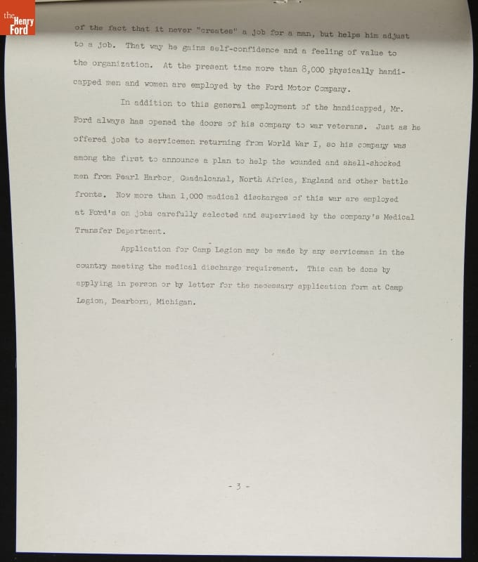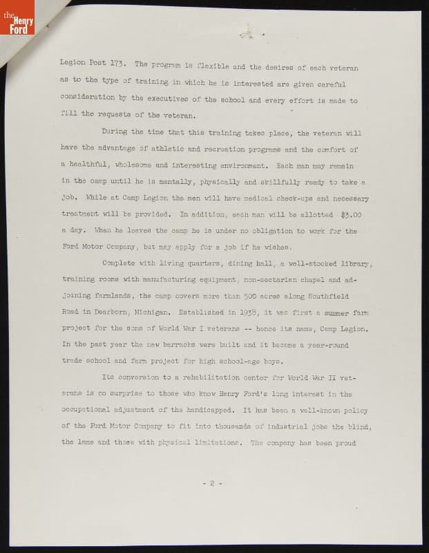 Henry Ford opened Camp Legion, near Dearborn, Michigan, in 1938 for sons of dead or disabled World War I veterans. The young men earned steady wages working there seasonally from April-November. The camp's mission was modified in 1944 to include rehabilitation of World War II veterans with disabilities. Veterans learned new skills to help them reenter the workforce.