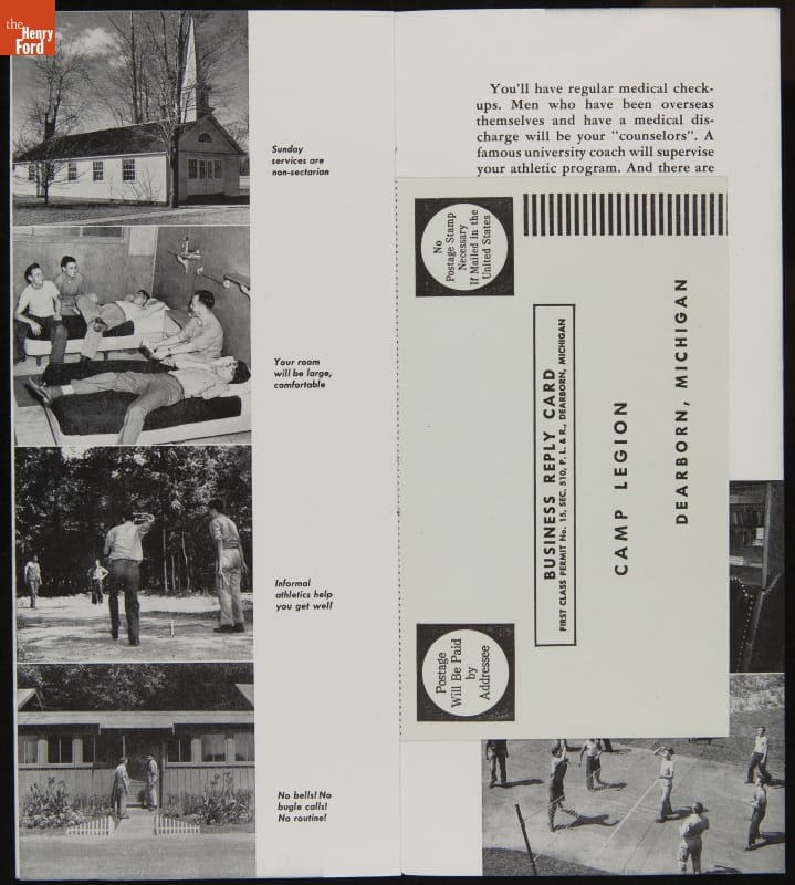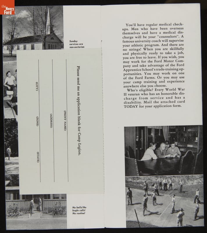 Henry Ford opened Camp Legion, near Dearborn, Michigan, in 1938 for sons of dead or disabled World War I veterans. The young men earned steady wages working there seasonally from April-November. The camp's mission was modified in 1944 to include rehabilitation of World War II veterans with disabilities. Veterans learned new skills to help them reenter the workforce.