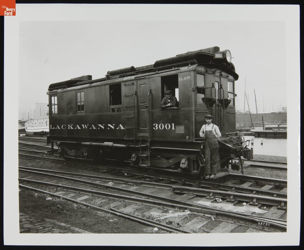 Diesel-electric locomotives, introduced on American railroads in the 1920s, offered several advantages over their steam-powered counterparts. They used less fuel, required less maintenance, and could be operated by smaller crews. Many early diesel-electrics proved themselves in yard service, like this unit switching cars at a marine terminal on the Delaware, Lackawanna & Western Railroad.