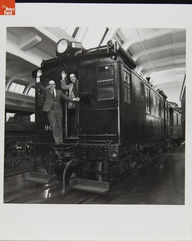 M. William Grant and Randy Mason with Restored Ingersoll-Rand Diesel-Electric Locomotive No. 90 in Henry Ford Museum, January 1985