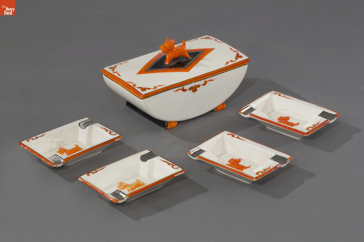 This ceramic set featured a popular motif of the 1930s and early 1940s -- the Scottish Terrier. Customers seeking a cigarette holder and matching ash trays could purchase the utilitarian mass-produced set for use during afternoon teas, card parties, and other domestic gatherings prior to World War II.