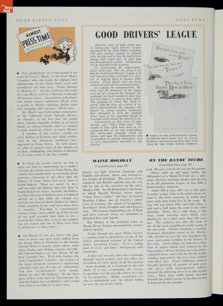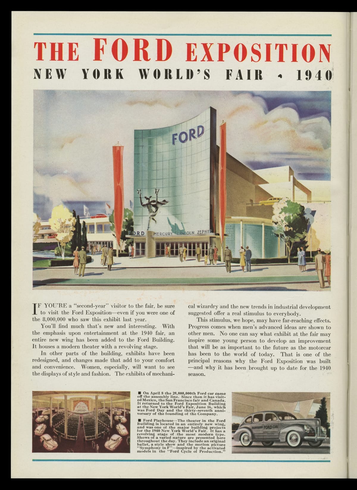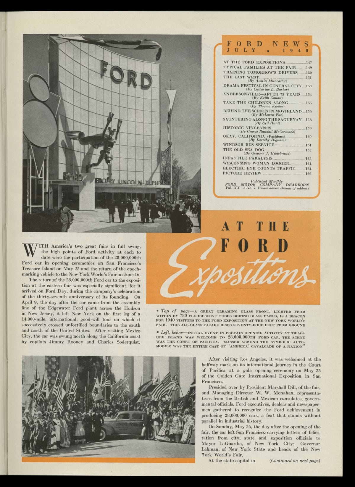 Ford Motor Company published Ford News from 1920 to 1942. The magazine kept employees and dealers informed on the automaker's products and activities. Each issue contained general-interest stories as well. The July 1940 edition covered Ford's exhibits at the New York World's Fair -- many of them updated for the fair's second season.