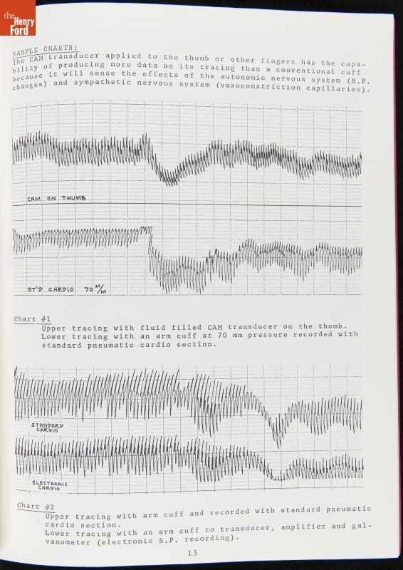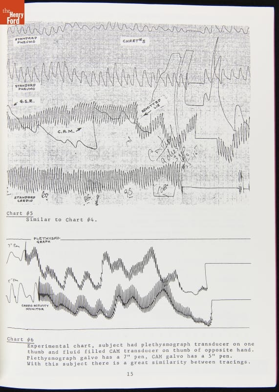 Polygraphs are more popularly known as "lie detector" machines. They measure a person's pulse, breathing rate, perspiration, and blood pressure. Polygraphs convert this data into electronic signals; inking arms output this information onto paper charts. Trained examiners interpret the results, to determine guilt or innocence. The polygraph has been called out as unethical and legally inadmissible in some cases.
