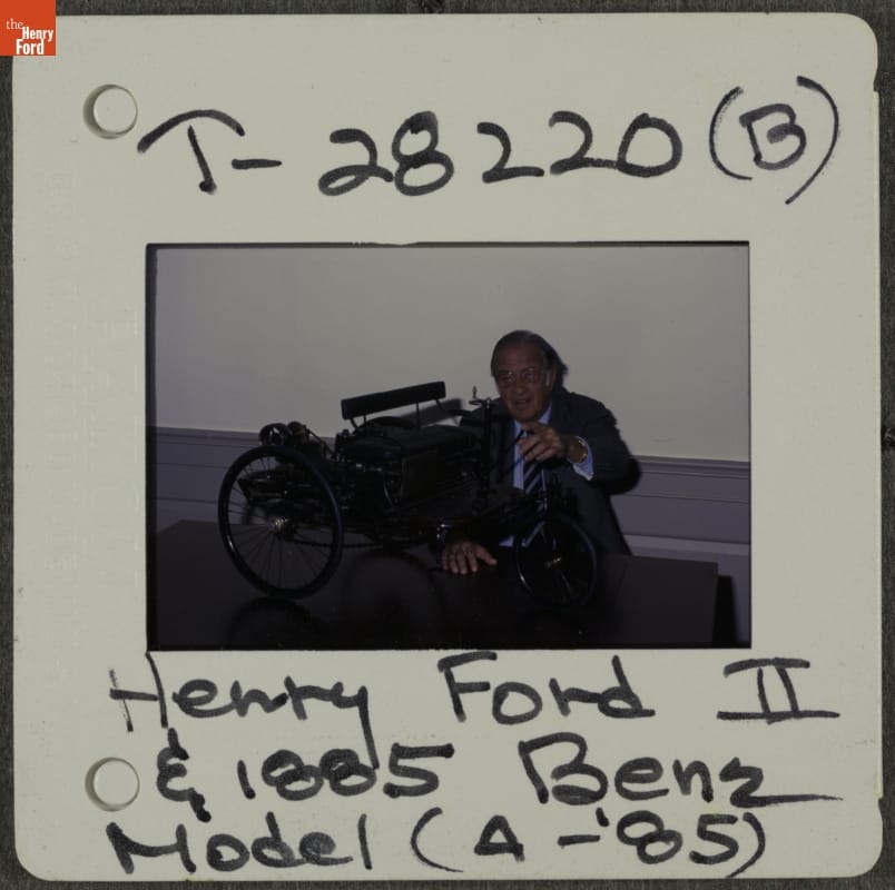 Henry Ford II commemorated the centennial of the Benz Patent-Motorwagen in 1985. Built in Germany by engineer Karl Benz in 1885, the Motorwagen generally is credited with being the first self-propelled vehicle designed around the internal combustion engine. The one-fifth scale model was given to Mr. Ford's grandfather, Henry Ford, on his 75th birthday in 1938.