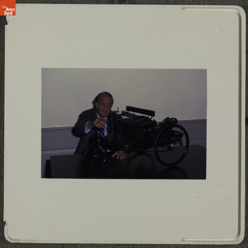 Henry Ford II with the 1885 Benz Scale Replica at Henry Ford Museum, April 1985