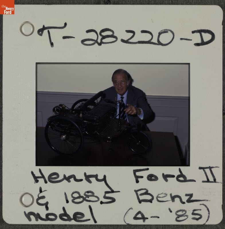 Henry Ford II commemorated the centennial of the Benz Patent-Motorwagen in 1985. Built in Germany by engineer Karl Benz in 1885, the Motorwagen generally is credited with being the first self-propelled vehicle designed around the internal combustion engine. The one-fifth scale model was given to Mr. Ford's grandfather, Henry Ford, on his 75th birthday in 1938.