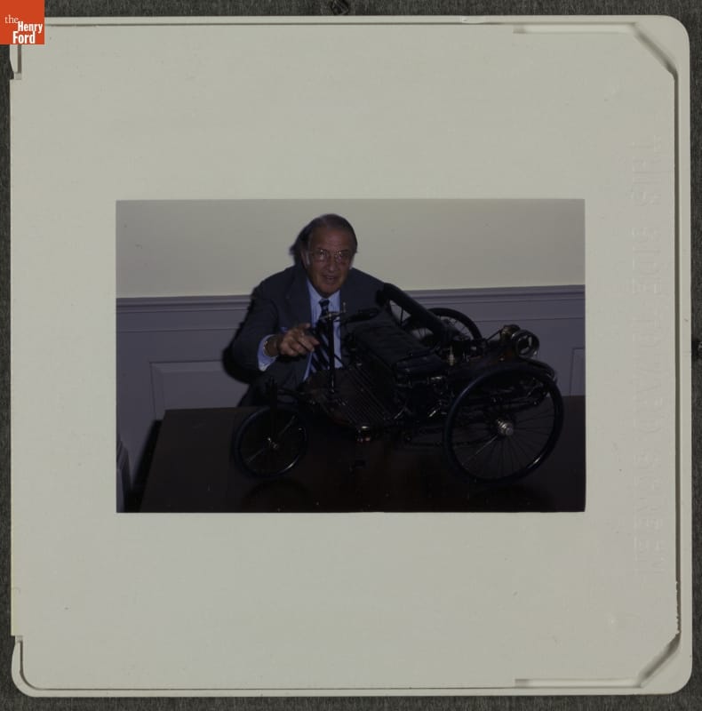 Henry Ford II with the 1885 Benz Scale Replica at Henry Ford Museum, April 1985