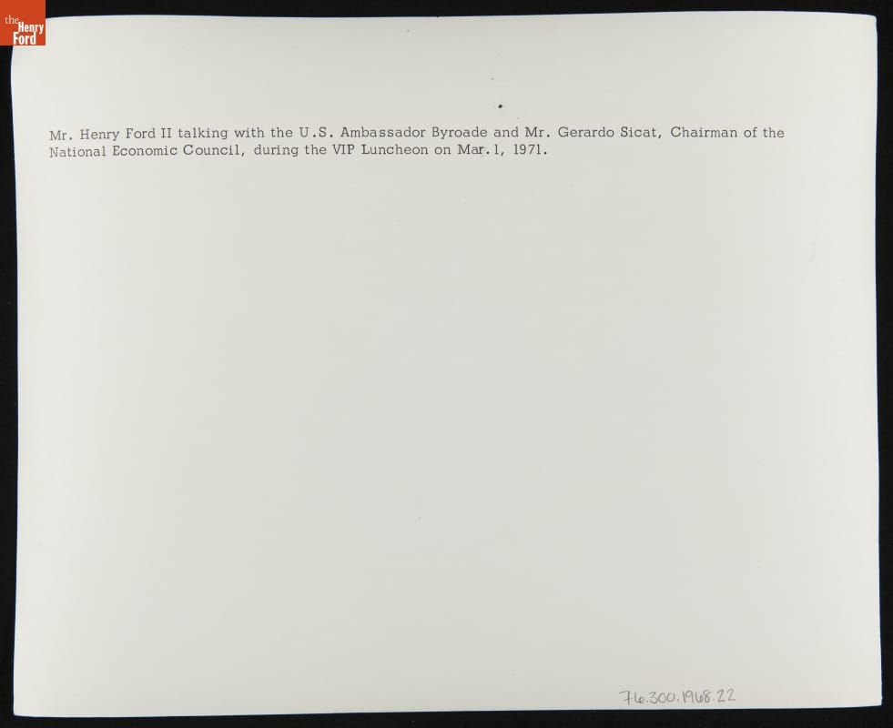 Henry Ford II with Ambassador Byroade and Gerardo Sicat during the VIP Luncheon, Philippines, March 1971