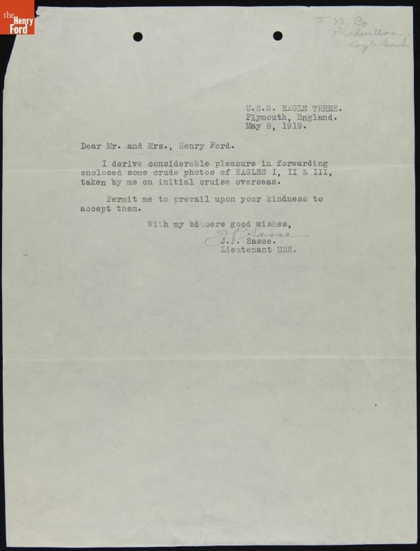 Letter from Lieutenant J.P. Sasse to Clara and Henry Ford regarding USS Eagle Boats, May 8, 1919