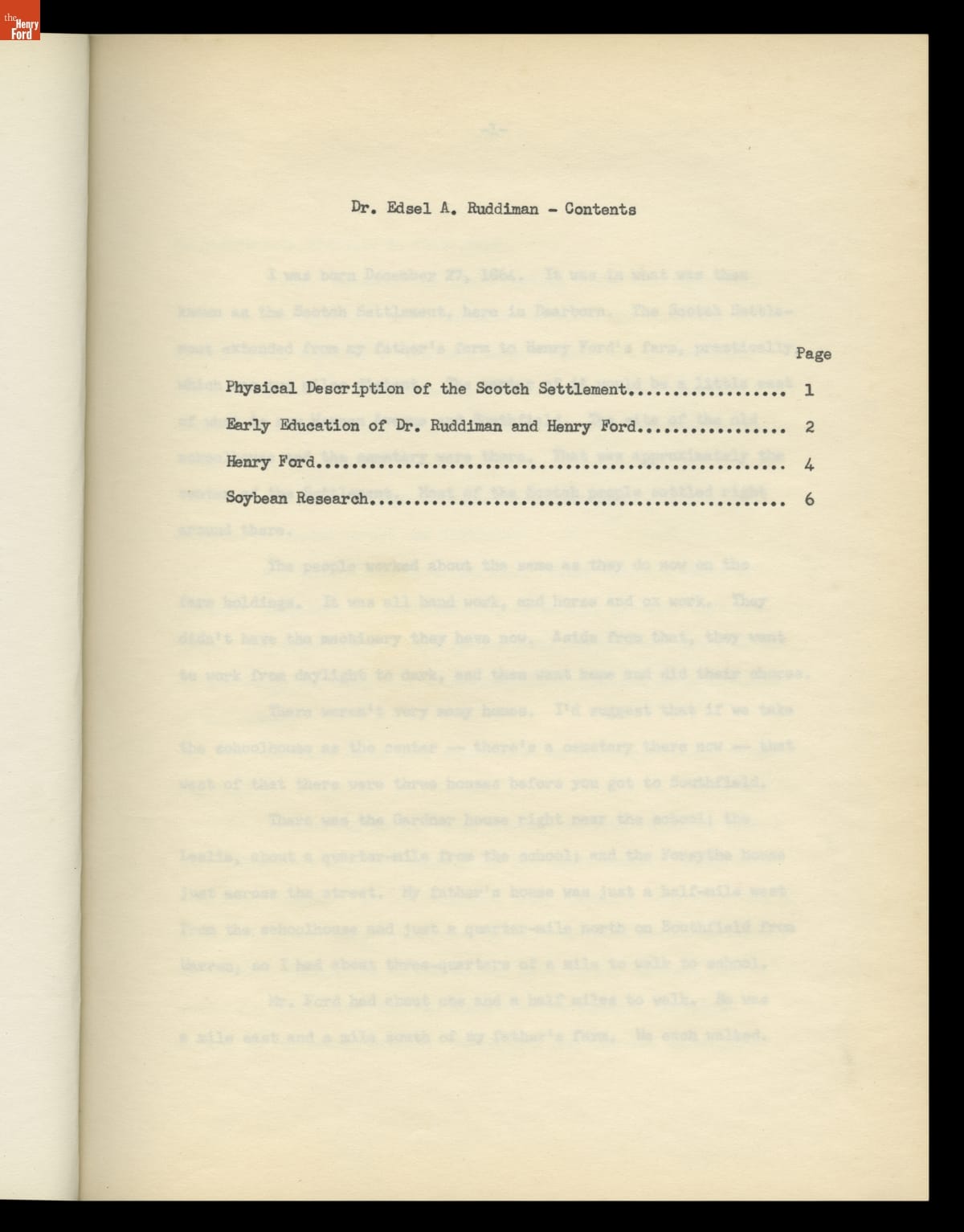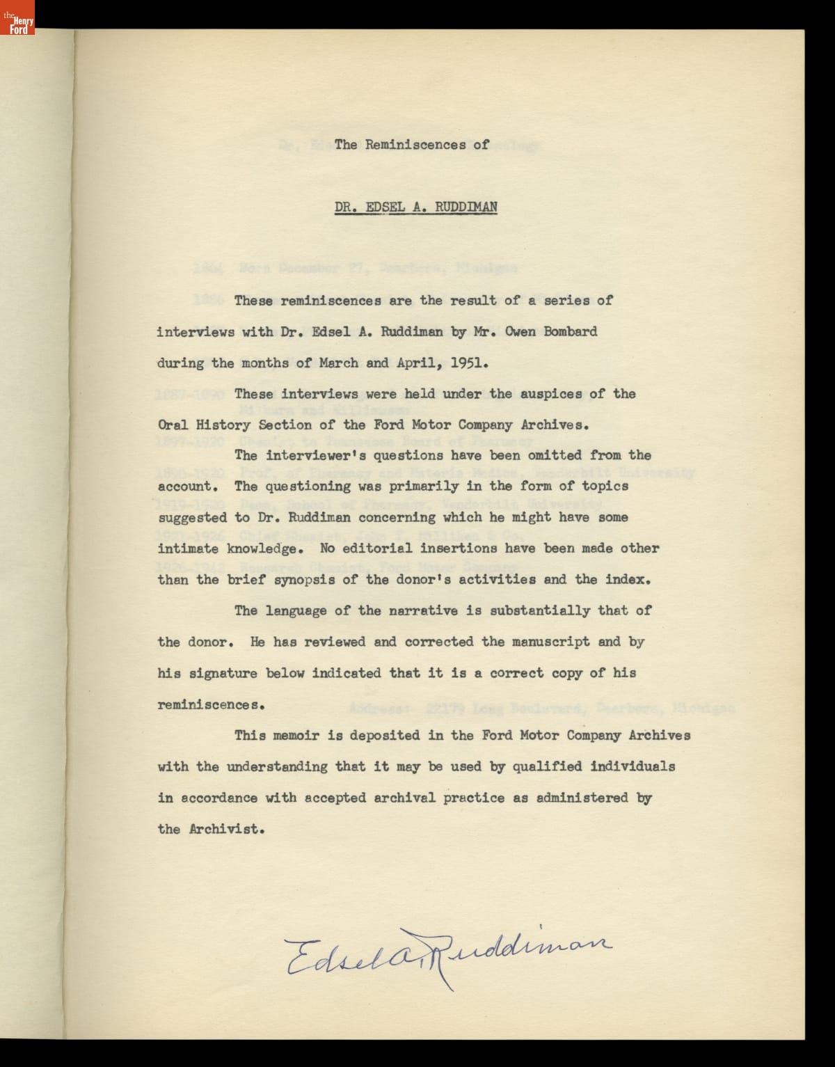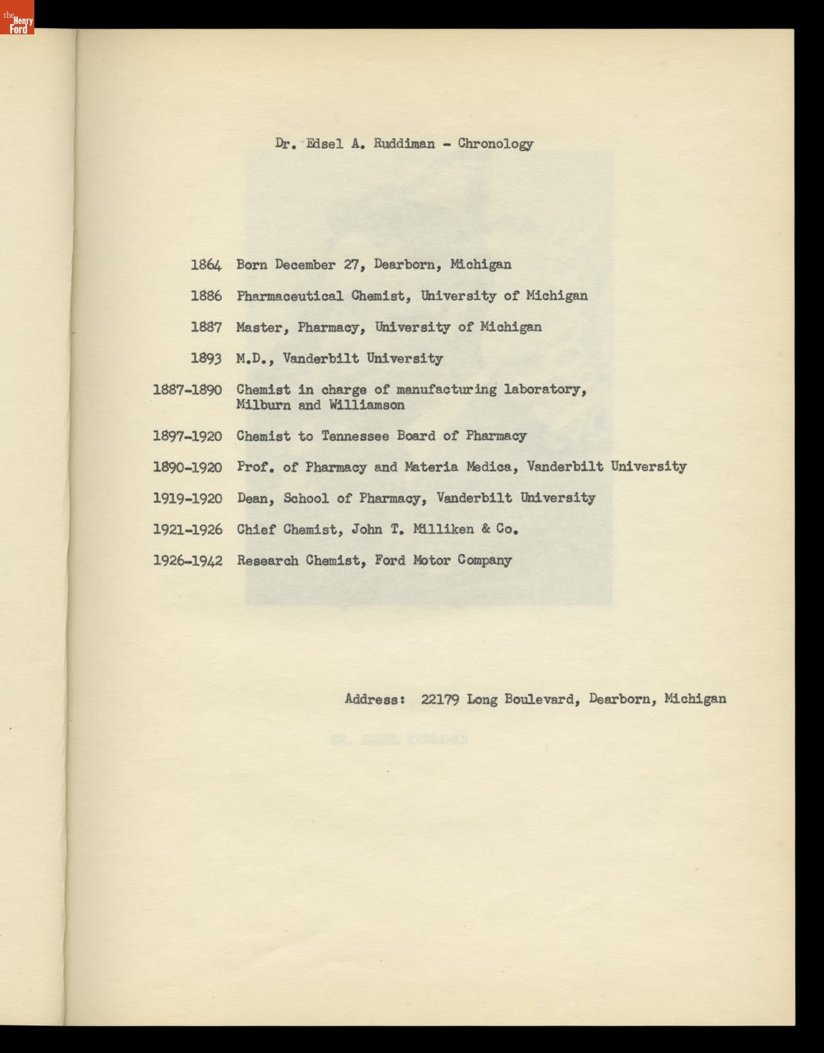 Edsel Ruddiman was a lifelong friend of Henry Ford's. As boys, they attended the same Scotch Settlement School, where they shared a love of pranks. Years later, Ruddiman worked as a research chemist on Ford's efforts in chemurgy -- promoting the use of agricultural products in industry. Henry and Clara Ford named their only child, Edsel Ford, after Ruddiman.