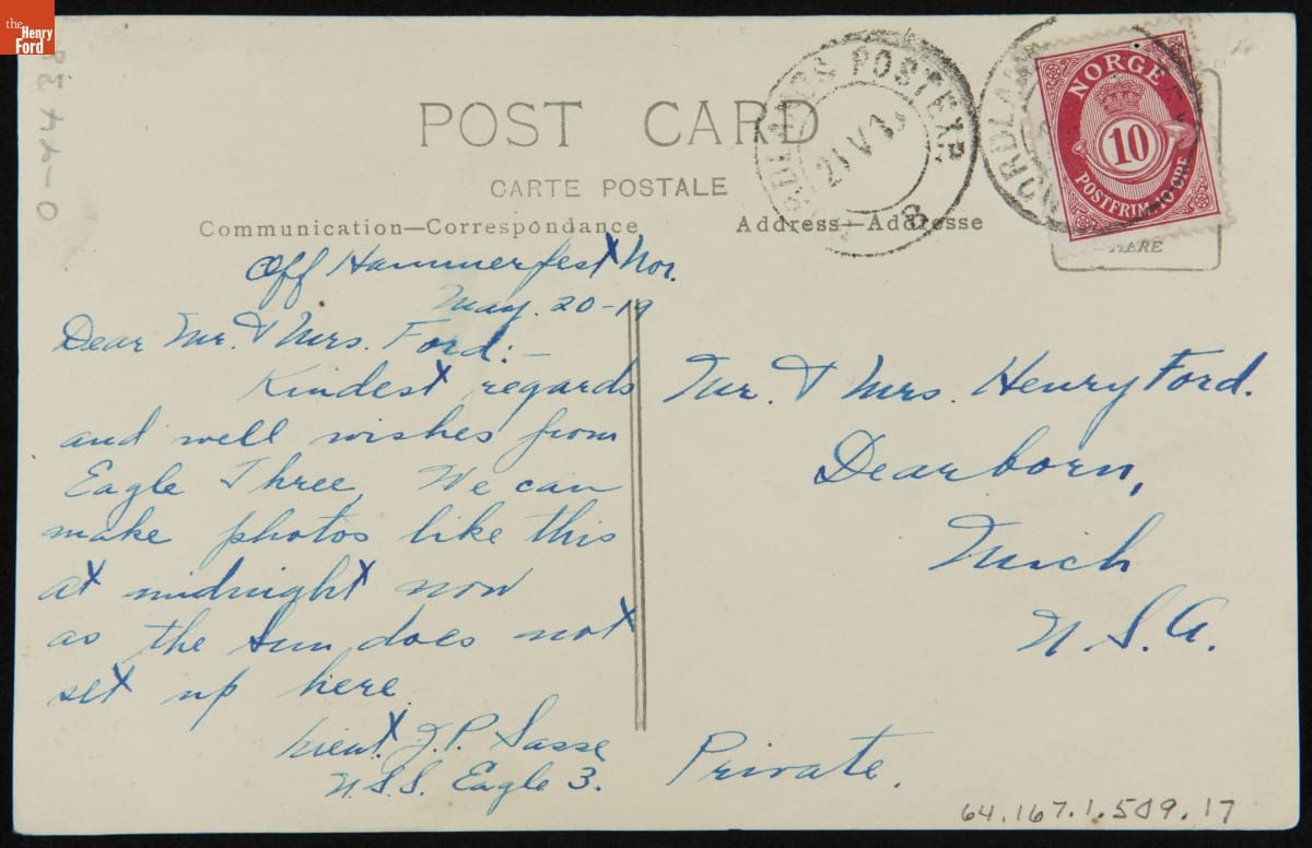 Off Hammerfest Nor. / May 20-19 / Dear Mr. & Mrs. Ford:--Kindest regards and well wishes from Eagle Three. We can make photos like this at midnight now as the Sun does not set up here / Lieut. J.P. Sasse U.S.S. Eagle 3. Private / Mr. & Mrs Henry Ford. Dearborn, Mich U.S.A.