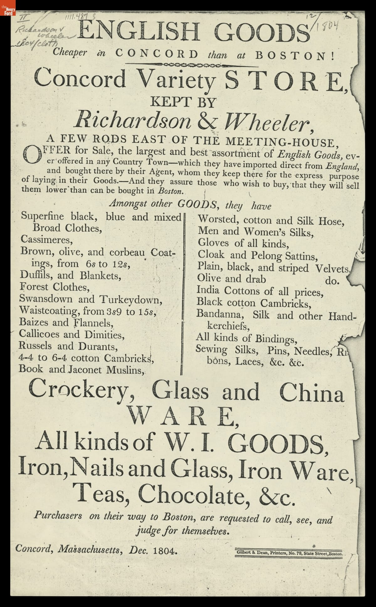 Advertisement, Richardson & Wheeler Variety Store, Concord, Massachusetts, December 1804