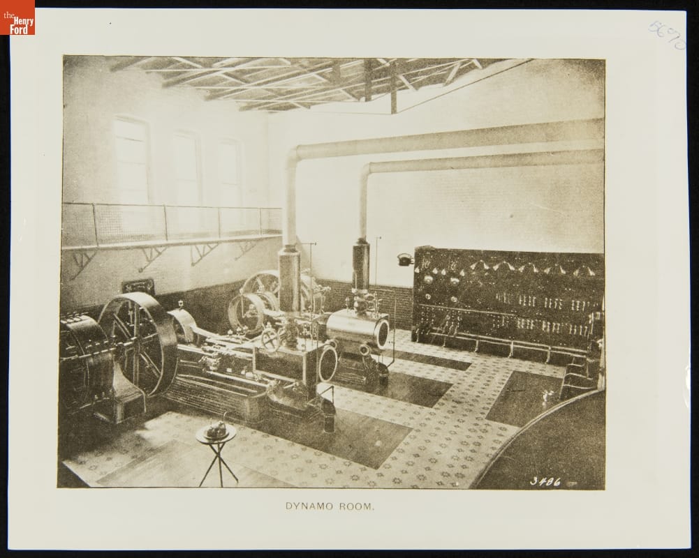 In 1898, a modern electric light and power plant was completed at the Eastern Michigan Asylum in Pontiac. Inside, dynamos, motors, machines, and a range of switches and meters helped power the institution's growing infrastructure. This photograph shows the interior of the dynamo room. Hospital administrators funded a new power plant in 1929.