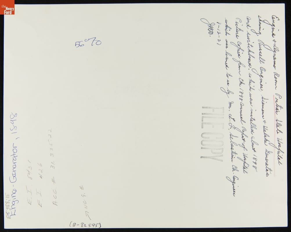 The original photographer is unidentified. Copied in 1930 by Ford Motor Company Engineering Photographic Department.