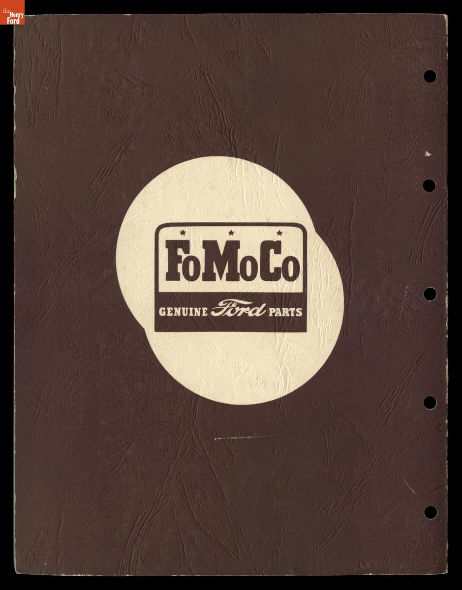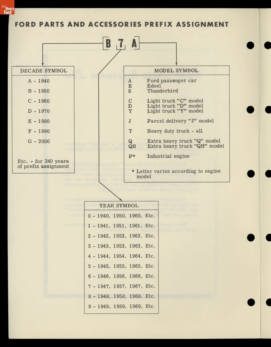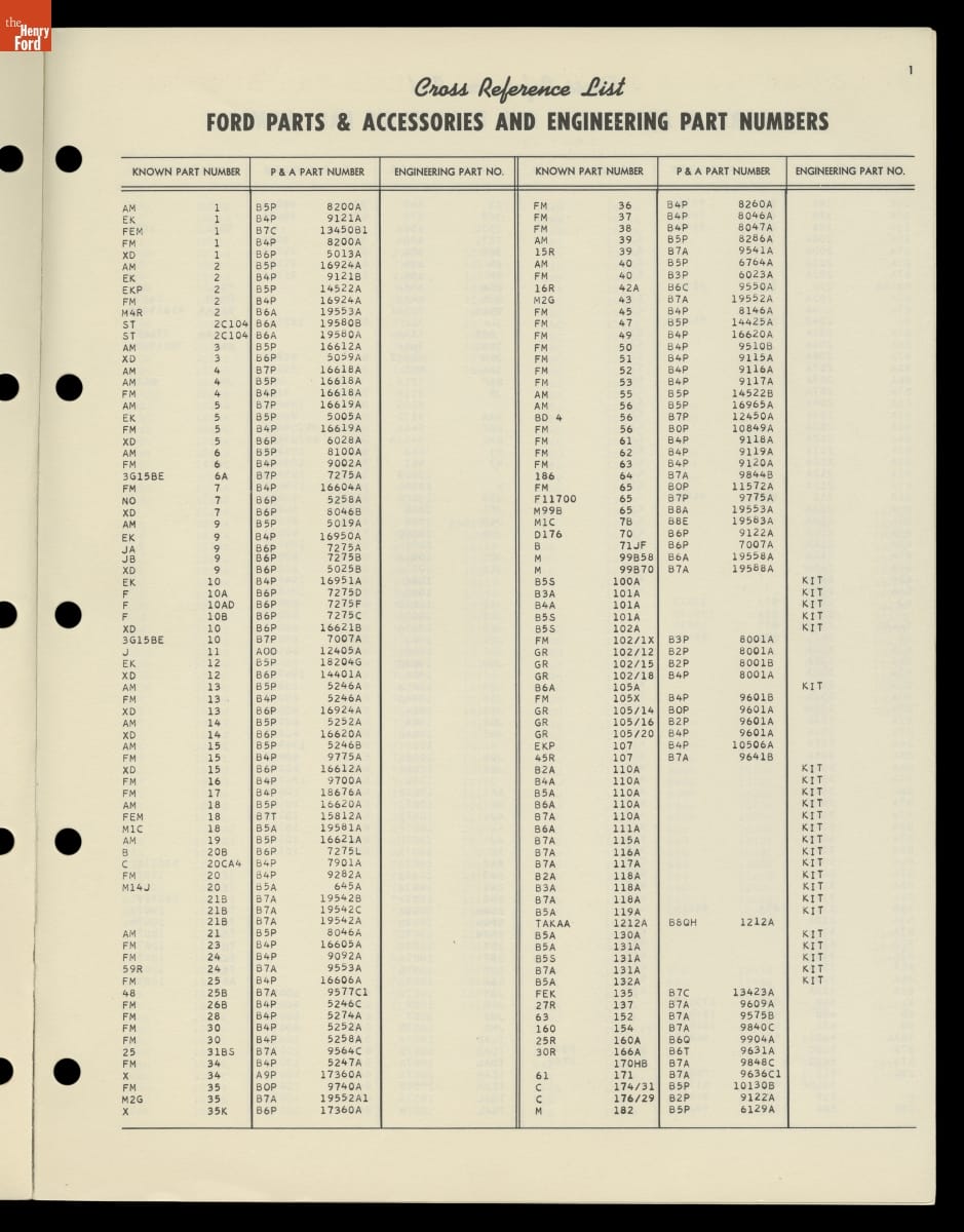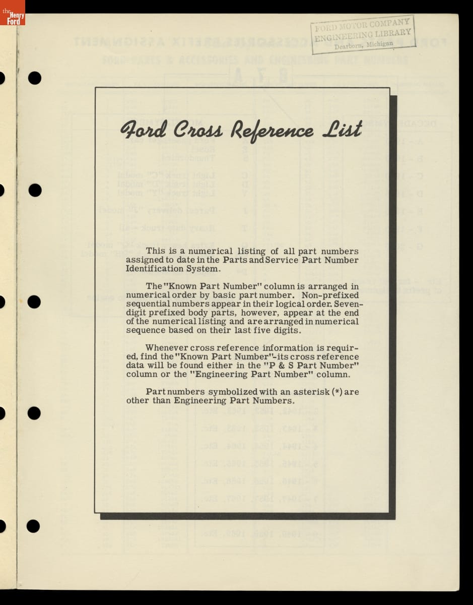 An automobile has thousands of parts. New and replacement parts are carefully cataloged and inventoried using unique part numbers. Sometimes different numbers are assigned to the same part by different departments. This 1958 Ford Motor Company list cross-references Parts and Service part numbers with their corresponding Engineering part numbers.