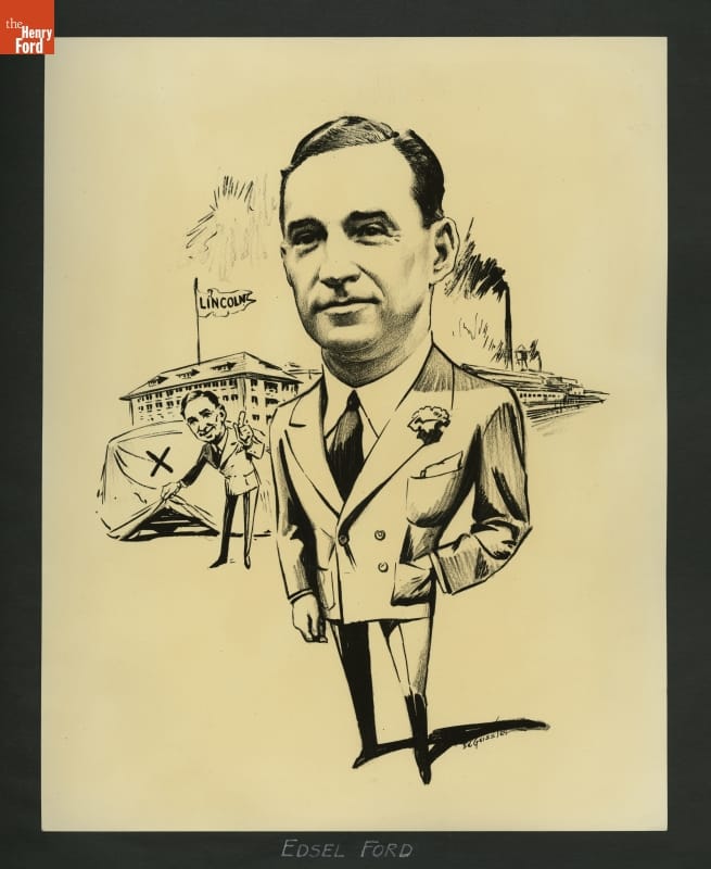 Artist Ed Geissler created this caricature of Edsel Ford around 1935. It has the then-president of Ford Motor Company and Lincoln Motor Company standing in front of Lincoln's plant in Detroit, Michigan. On the left, a smaller drawing shows Mr. Ford preparing to reveal a new automobile -- perhaps it's the 1936 Lincoln Zephyr.