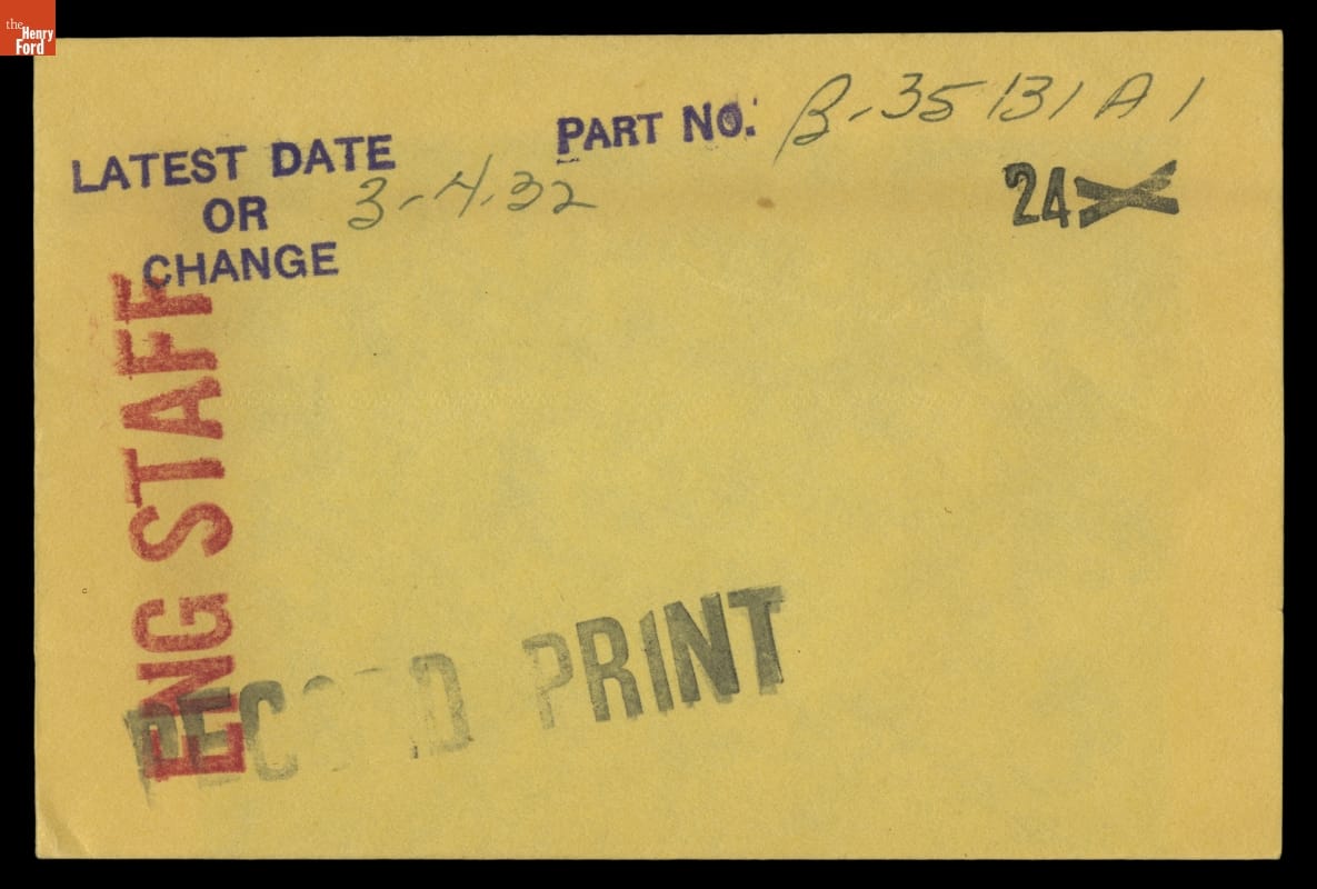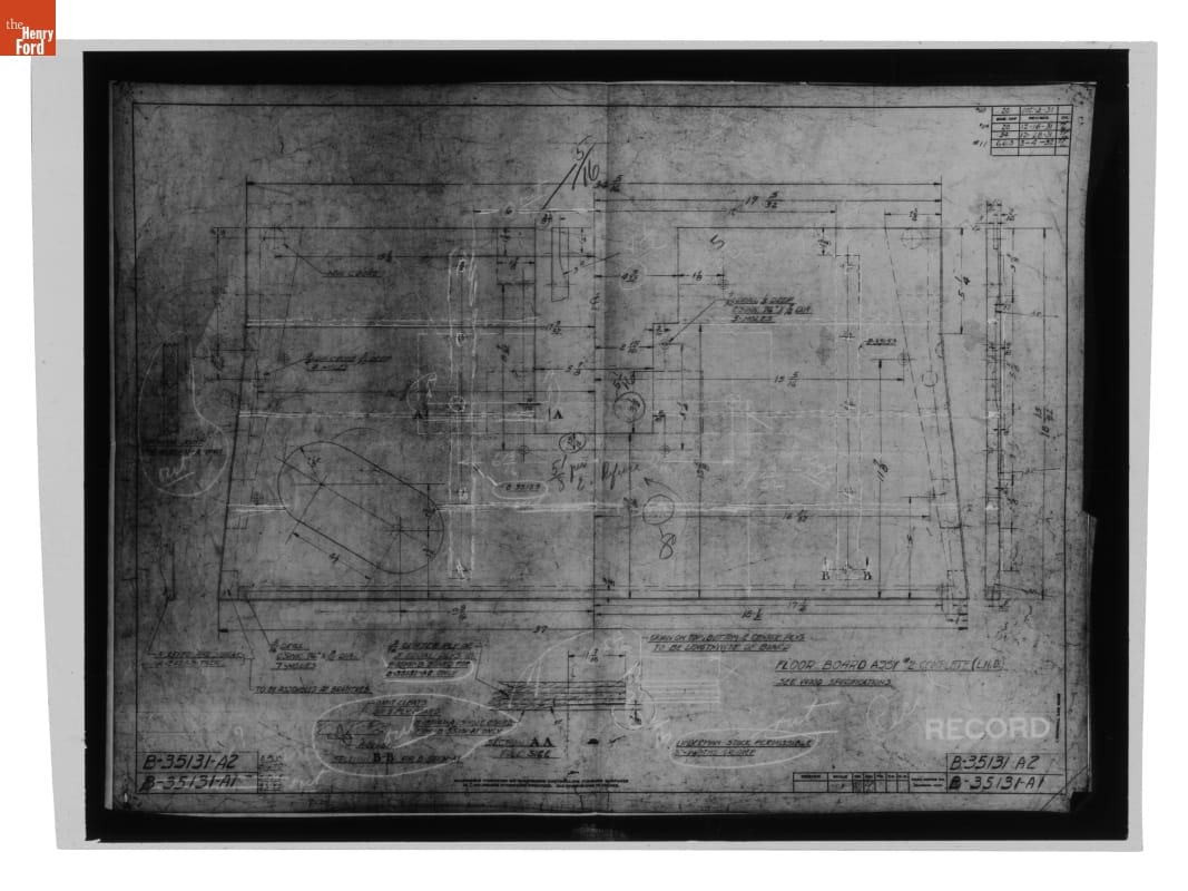The Ford Motor Company created over a million parts drawings from 1903 to 1957. Many of these drawings specify engineering requirements for the components of Ford-made vehicles--including automobiles, trucks, tractors, military vehicles and Tri-motor airplanes. Others document assembly components, stages of casting and forging, or experimental designs. Beginning in the 1940s, Ford transferred the drawings to microfilm.