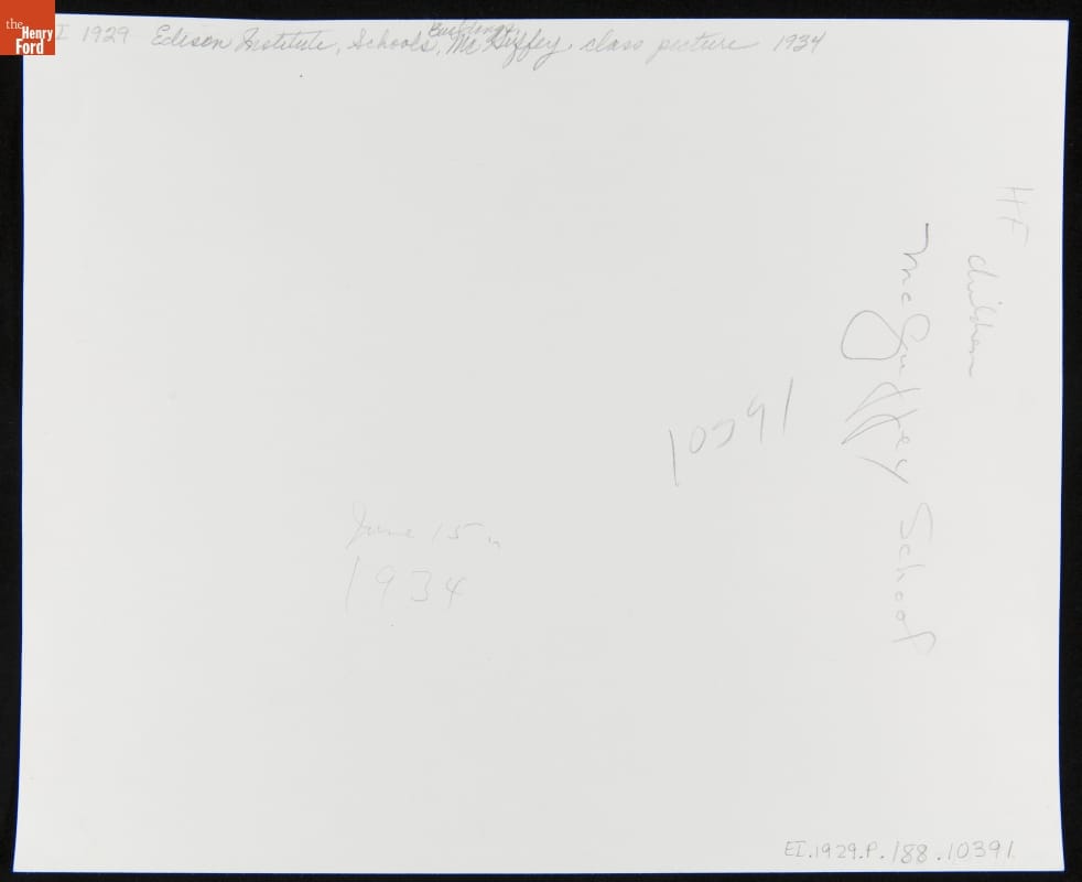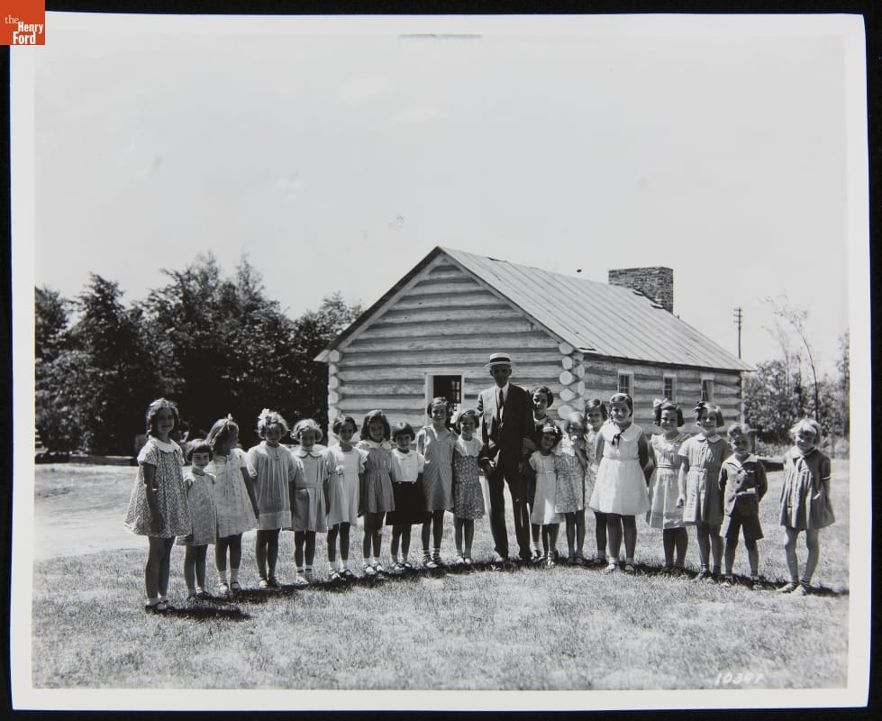 Henry Ford with Edison Institute Schoolchildren outside McGuffey School, Greenfield Village, June 1934