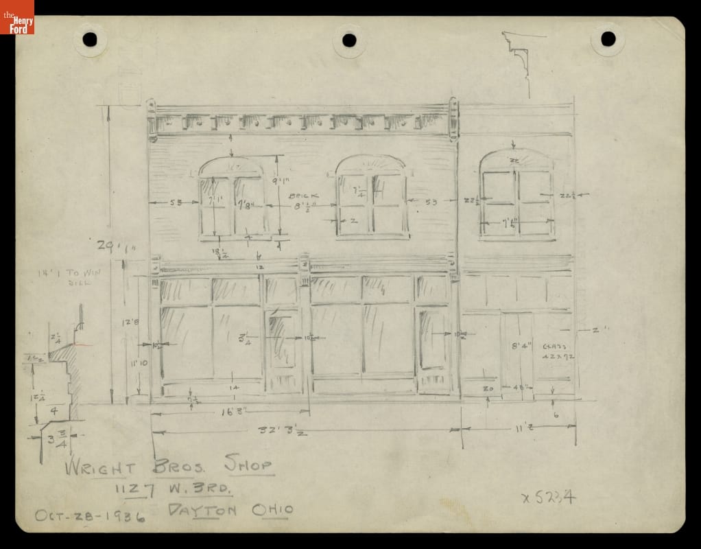 In October 1936, Henry Ford purchased the bicycle shop used by Wilbur and Orville Wright in Dayton, Ohio. Over the next 18 months, Ford relocated and reassembled the building at his Greenfield Village museum complex in Dearborn, Michigan. Before the move, architect Edward Cutler made detailed drawings of the shop to ensure the project's accuracy.