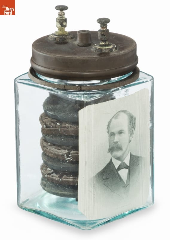 In the late 19th and early 20th centuries, people used batteries to power telegraph and telephone systems, ring bells and alarms, run small appliances, or spark gasoline engines. A variety of companies produced wet cell batteries to meet this growing need. The glass jar held a conductive solution surrounding the carbon and zinc elements that produced an electrochemical reaction.