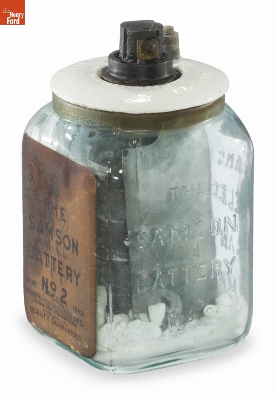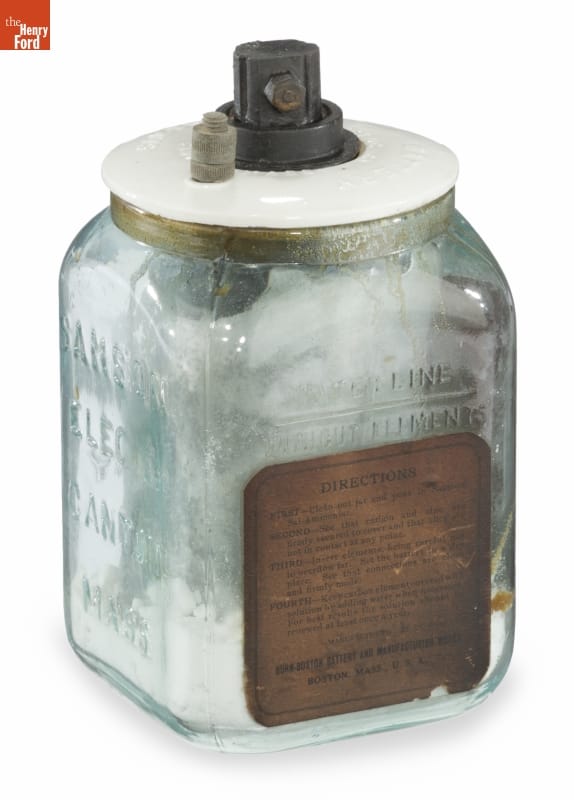 In the late 19th and early 20th centuries, people used batteries to power telegraph and telephone systems, ring bells and alarms, or spark gasoline engines. The Burn Boston Battery and Manufacturing Works (established in 1910) made grounding devices and batteries. The glass jar held a conductive solution surrounding the carbon and zinc elements that produced an electrochemical reaction.