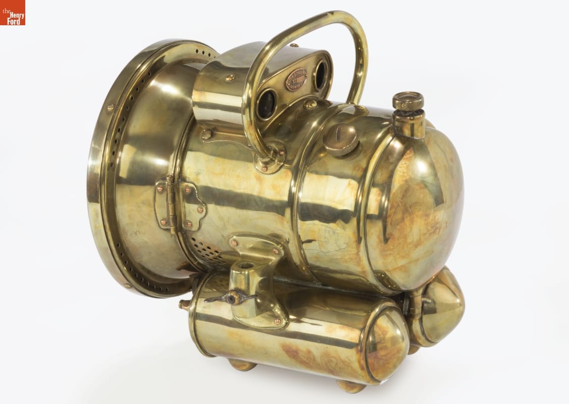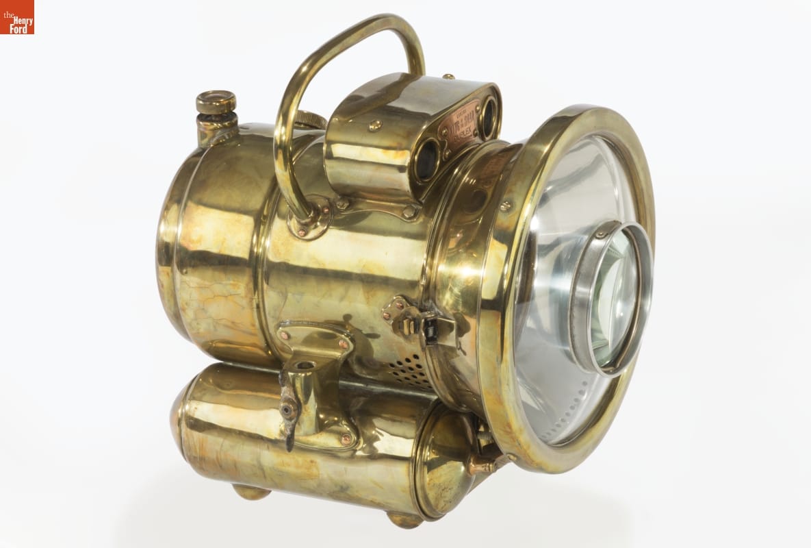 Drivers in the early 1900s attached headlights to their automobiles to help light their way at night. To use this "King of the Road" model, automobilists filled the chambers with calcium carbide and then added water creating acetylene gas. Igniting the gas burner produced a strong white light. The lamp's lens and parabolic reflector cast a broad beam lighting the road ahead.