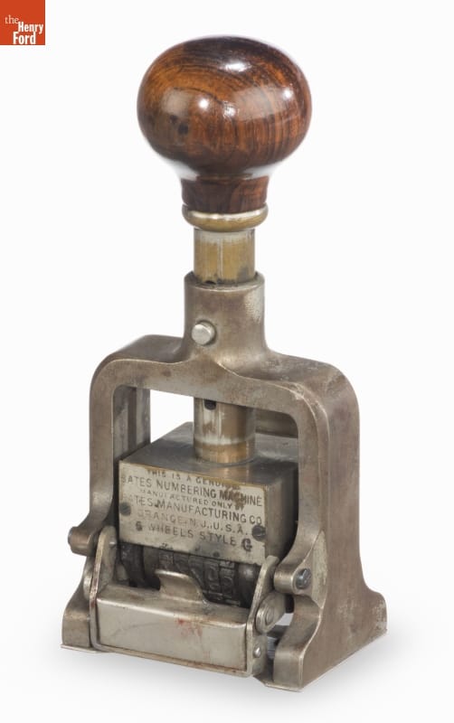 The Bates numbering machine helped organize and manage business paperwork. Office workers used it to stamp consecutive numbers or numbers in a repeated pattern onto pages of documents. The mechanism -- an improvement patented by Edwin G. Bates in 1891 -- automatically changed the number, making quick work for staff.