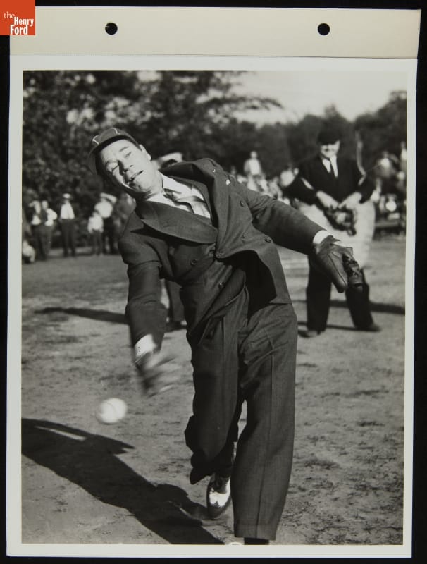 Comedian Joe E. Brown "Pitching," Ford Baseball Team Game, August 1942