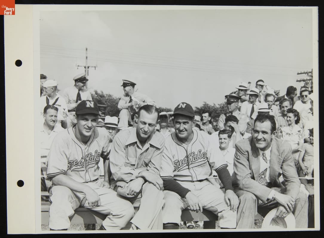 The Great Lakes Naval Training Station Bluejackets traveled to Dearborn, Michigan, to play the Ford All-Stars on July 14, 1943. The Bluejackets had two former Detroit Tigers on the team: outfielder Barney McCosky (left) and all-star catcher and Bluejackets' manager Mickey Cochran (3rd from left). Watching the game were several other former Tigers, including outfielder Jo-Jo White (2nd from left) and pitcher Elden Auker (right).