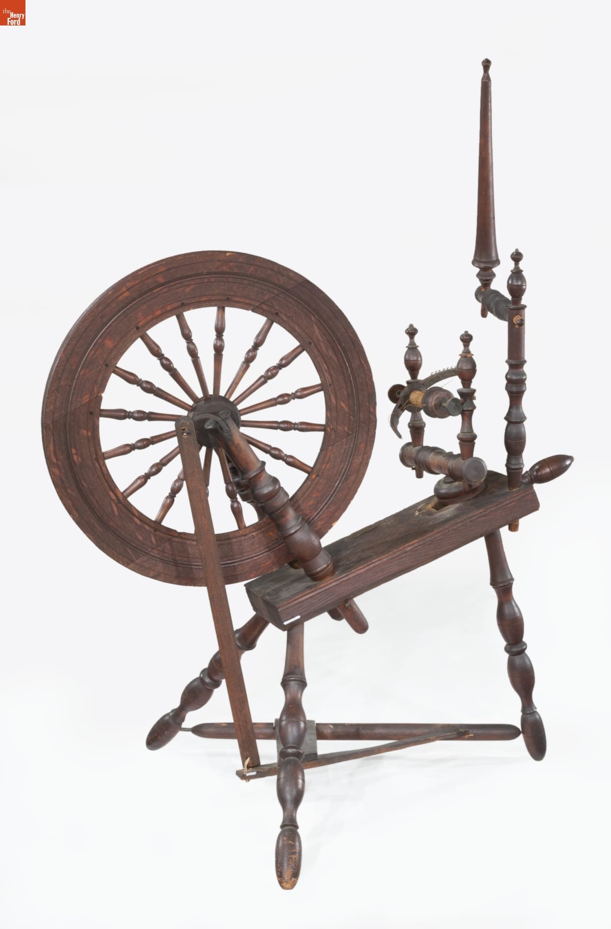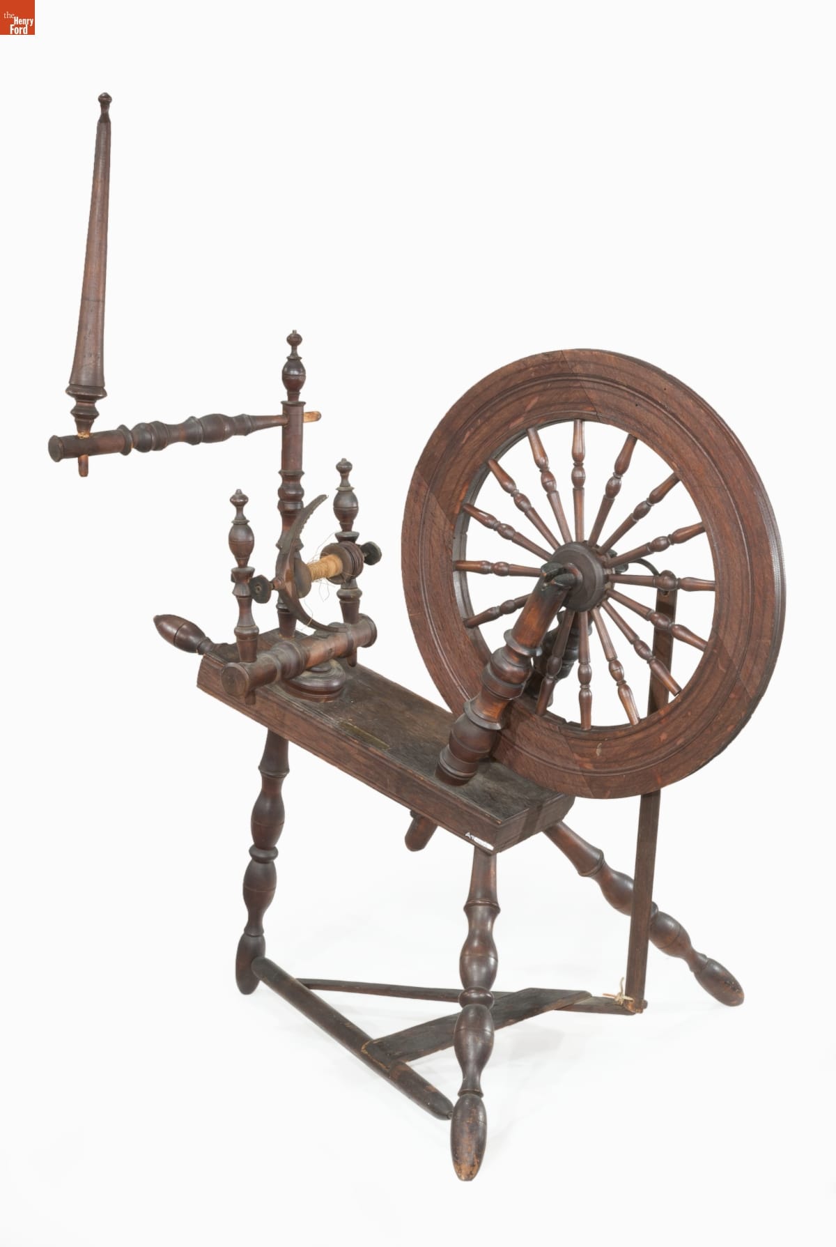 Spinning wheels come in a rich diversity of sizes and shapes depending on where and when they were made and the fibers they were intended to spin. This Saxony-style wheel, as its name suggests, was developed in northern Europe but was widely used in America. Intended for spinning flax fiber into linen yarn, these wheels often featured a built-in upright distaff to conveniently hold the raw flax fibers for the spinner.