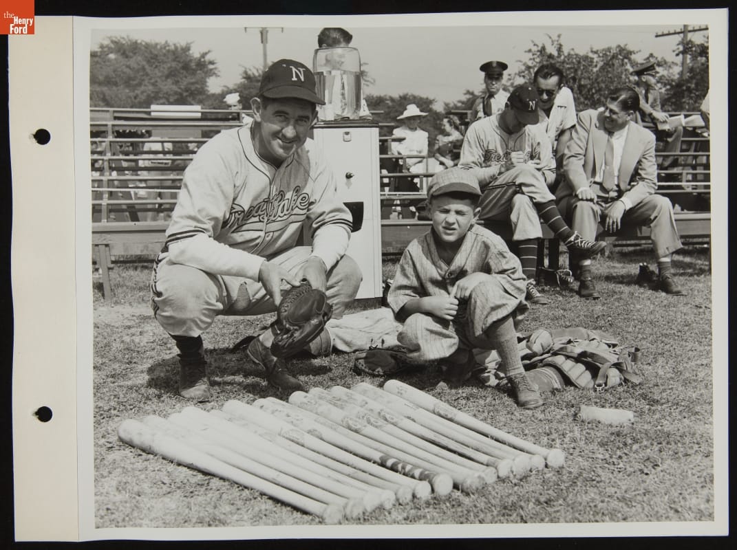 The Ford All-Stars defeated the visiting Great Lakes Naval Training Station Bluejackets 2-1 in a July 5, 1944, baseball match. Eight thousand fans came out to Ford's Rotunda Field to root on the hometown team. The All-Stars did not disappoint, winning on a ninth-inning home run. The Bluejackets were coached by former Detroit Tigers manager and all-star catcher Mickey Cochrane (seen here).