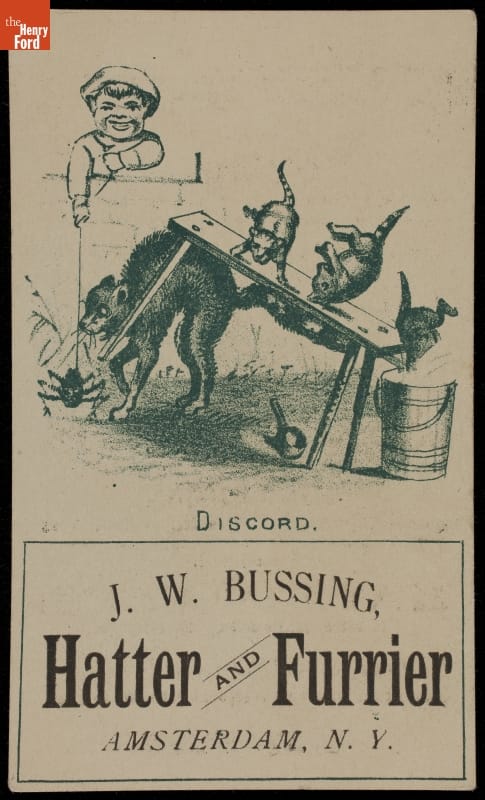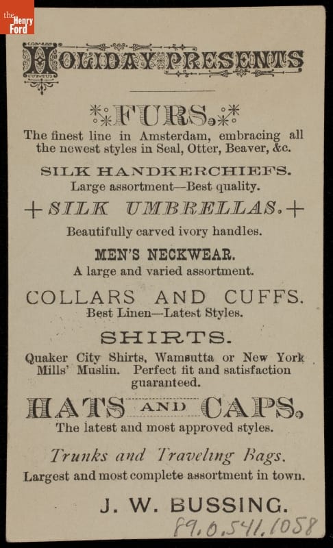 Trade Card for Men's Hatter and Furrier, J. W. Bussing, circa 1885