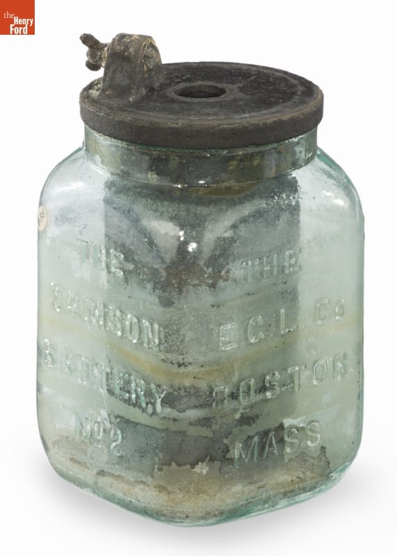 In the late 19th and early 20th centuries, people used batteries to power telegraph and telephone systems, ring bells and alarms, or spark gasoline engines. The Electric Gas Lighting Company in Boston Massachusetts made this wet cell battery called the Samson. Its glass jar held a conductive solution surrounding the carbon and zinc elements that produced an electrochemical reaction.