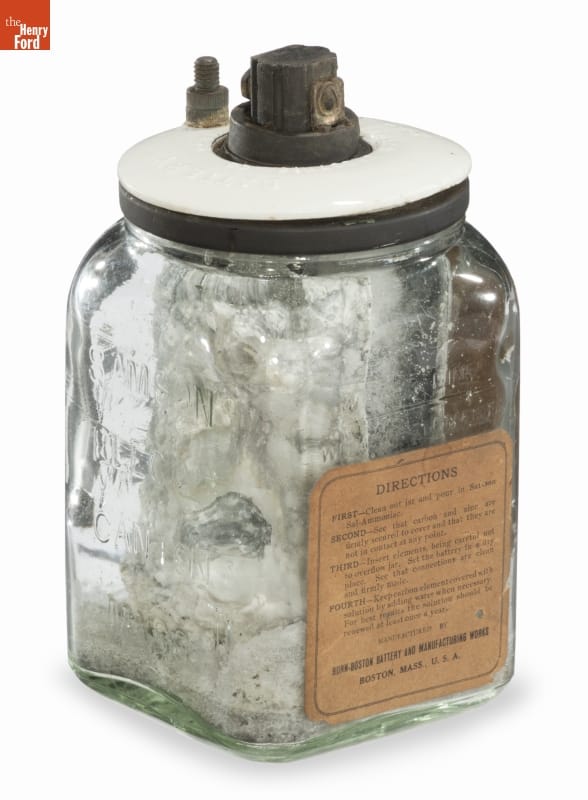 In the late 19th and early 20th centuries, people used batteries to power telegraph and telephone systems, ring bells and alarms, or spark gasoline engines. The Burn Boston Battery and Manufacturing Works (established in 1910) made grounding devices and batteries. The glass jar held a conductive solution surrounding the carbon and zinc elements that produced an electrochemical reaction.