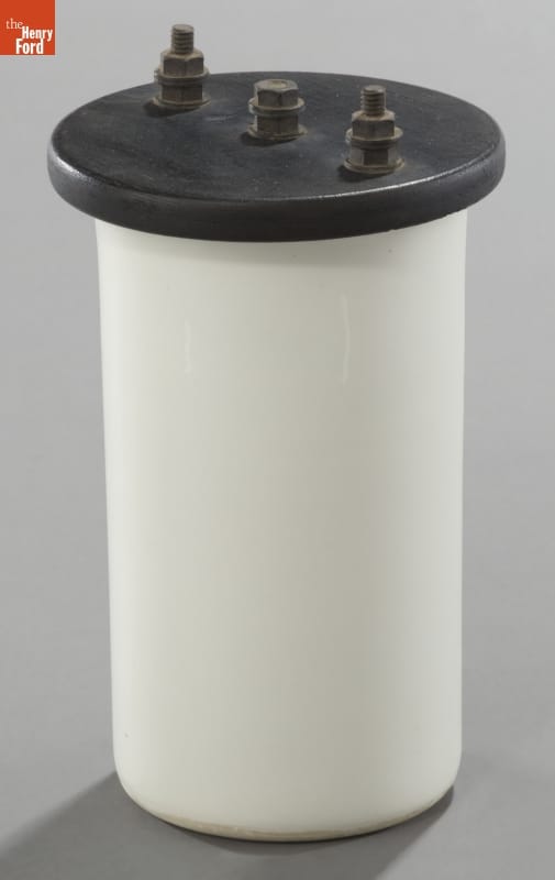 A chemical reaction hidden within this battery's white porcelain jar creates electricity. Thomas Edison developed this battery from an earlier design by Felix Lalande and Georges Chaperon. Batteries like this Type S powered fans, phonographs, telephones, and a variety of other devices for years in places where the electric grid did not reach, or electric generators were impractical.