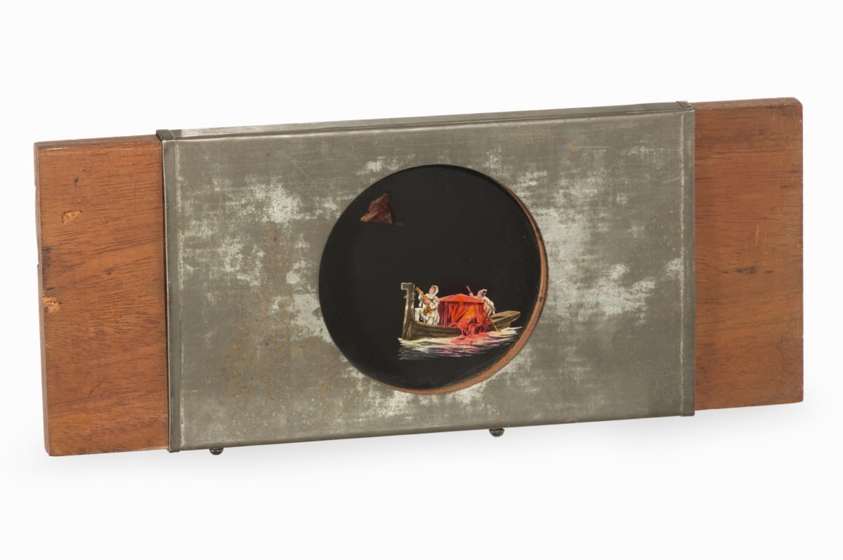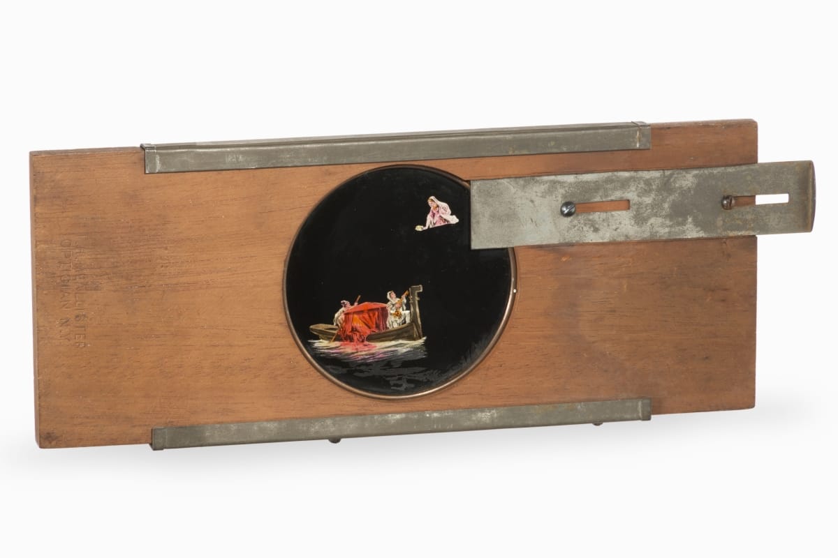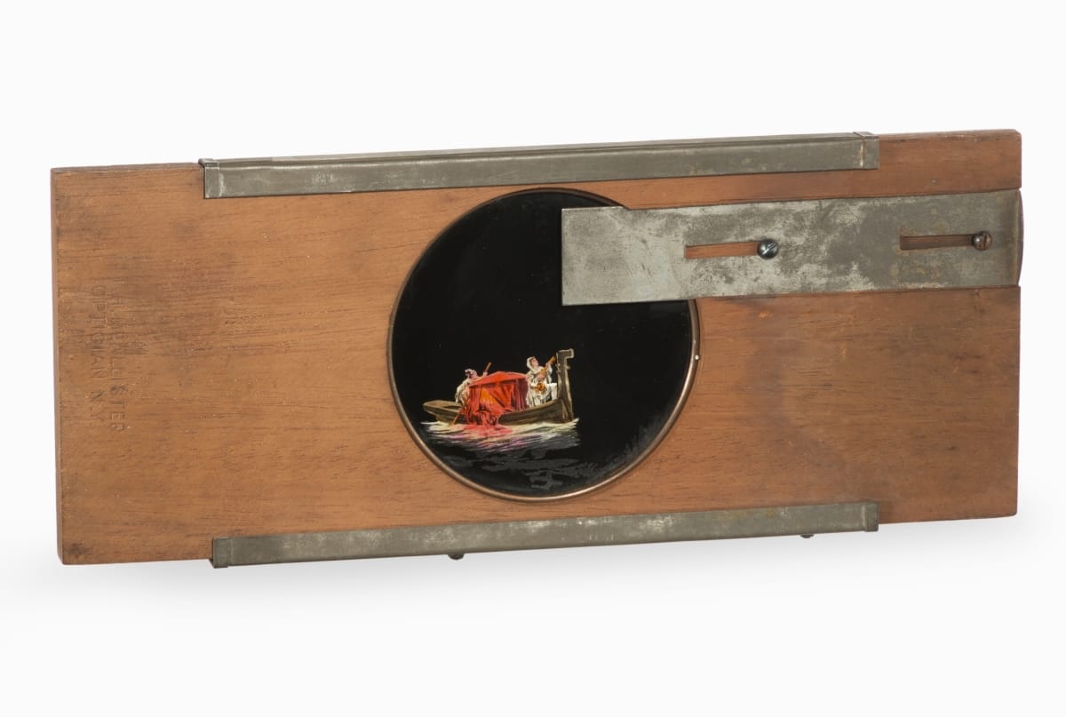 Magic lanterns use a concave mirror and light source to project images on glass slides with painted or photographic scenes. Developed in the 17th century, magic lanterns predate slide projectors and motion pictures. In the hands of magicians, they became "lanterns of fright," projecting wondrous images and apparitions. Slide themes ranged widely: exotic travel, folklore, advertising, history, science, and art.