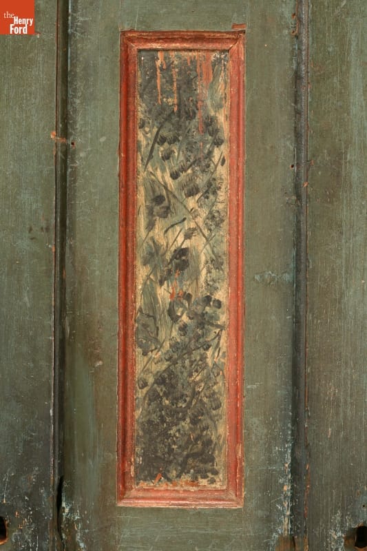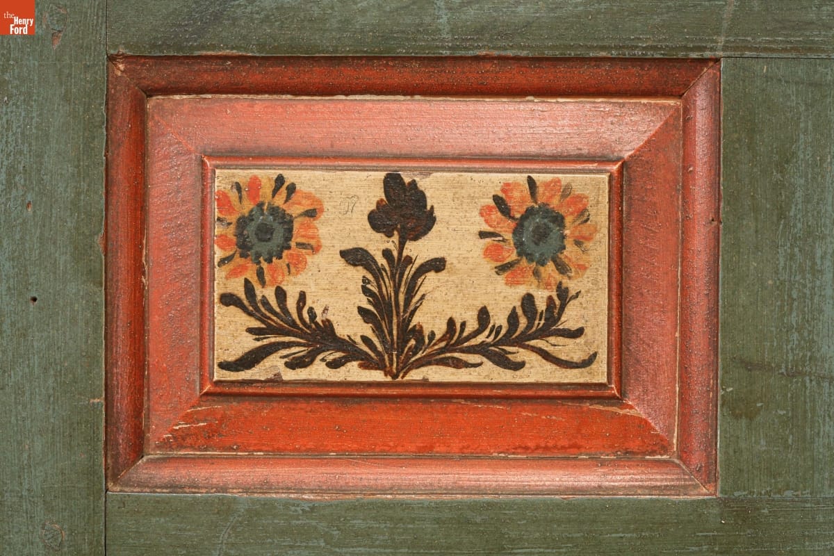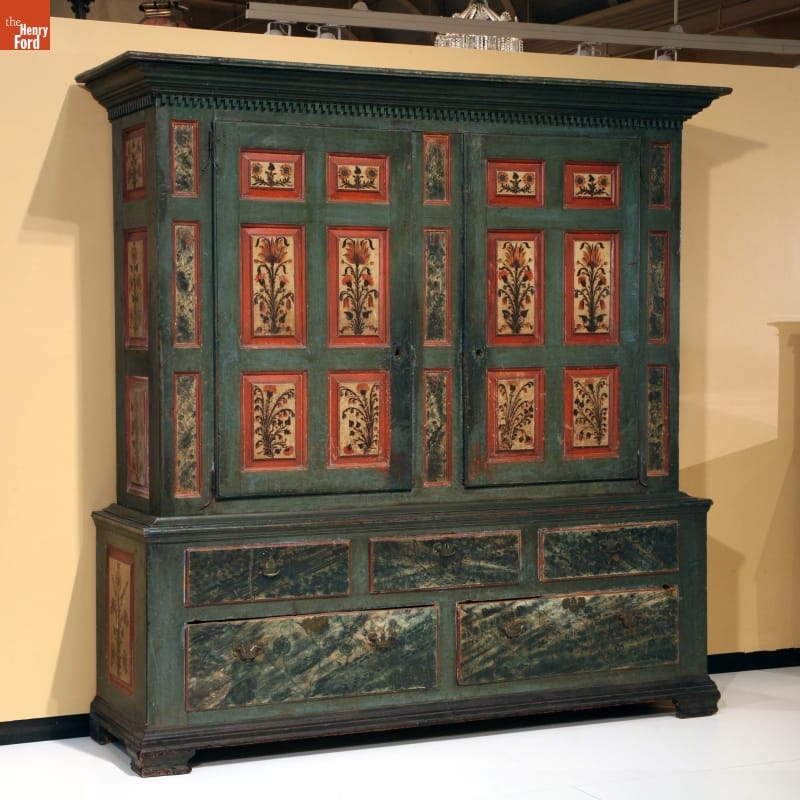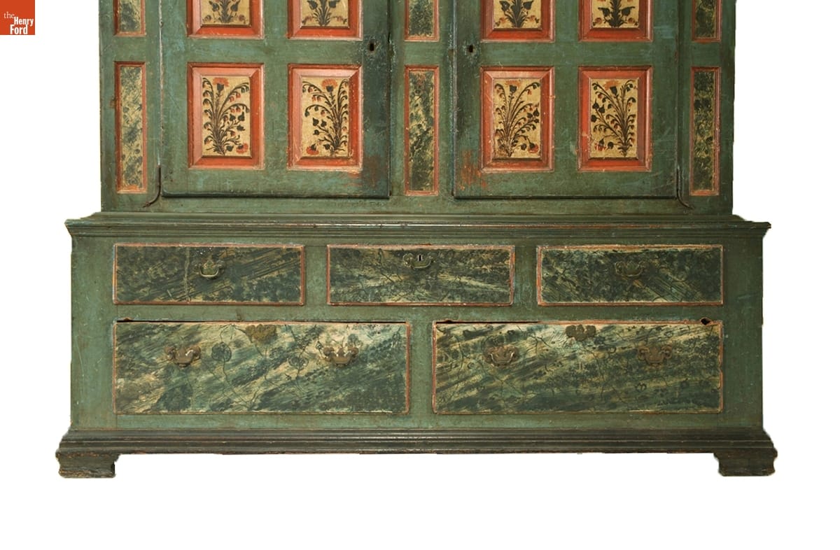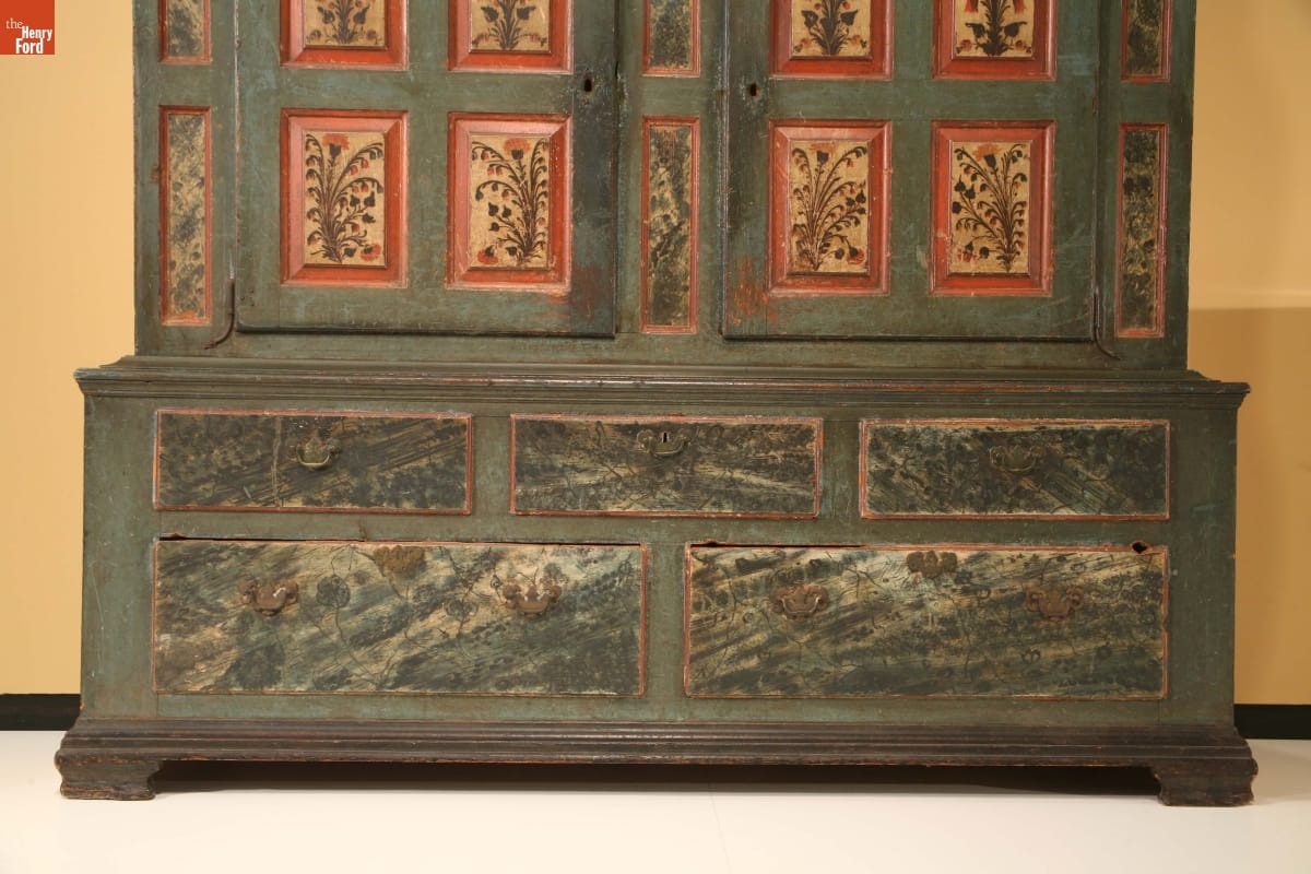 In the German immigrant areas of Pennsylvania, painted wardrobes with floral scenes were commissioned by prosperous farmers and merchants to show off their wealth and sophistication. This wardrobe is larger and more elaborately decorated than most, retaining much original paint, including extensive faux finishes on the drawer fronts.