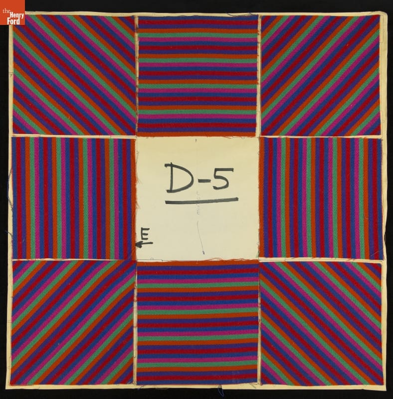 In 1961, Herman Miller opened the avant-garde "Textiles and Objects Shop" in New York City. Designer Alexander Girard conceived of the idea, designed the shop, and created many of the goods sold inside, including a colorful fabric-covered mirror. This design mock-up shows a possible geometric and color combination for the mirror.