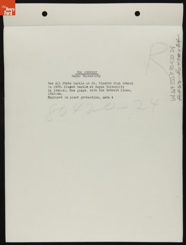 Tom Kennedy was an All-State football player at St. Vincent de Paul high school in Detroit before going on to play tackle at Wayne State University. Beginning in 1942, he played for the Detroit Lions. In 1944, he also worked security at Ford Motor Company. Ford regularly featured workers, such as Kennedy, and touted their activities and interests in factory and company newspapers.