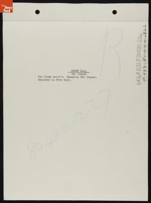 Henry Hall (1893-1986) was a notable ski jumper, twice setting the world record for furthest distance jumped. He would go on to be inducted into multiple halls of fame related to the sport. He was also employed as a firefighter by Ford Motor Company. Ford regularly featured workers, such as Hall, and touted their activities and interests in factory and company newspapers.