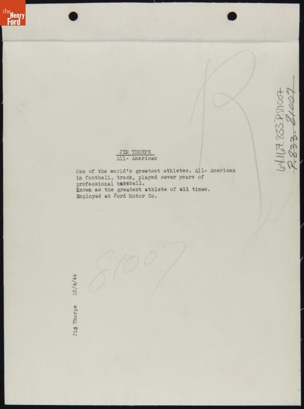 Jim Thorpe While Employed at Ford Motor Company, December 1944