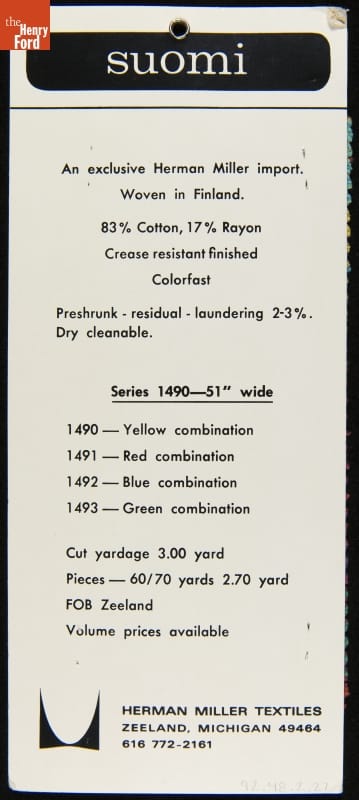 suomi / An exclusive Herman Miller import. / Woven in Finland. / 83% Cotton, 17% Rayon / Crease resistant finished / Colorfast / Preshrunk - residual - laundering 2-3%. / Dry cleanable. [...] HERMAN MILLER TEXTILES / ZEELAND, MICHIGAN 49464