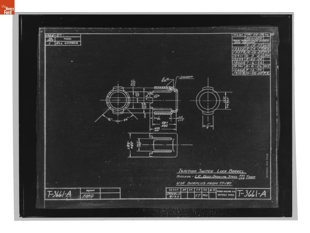 The Ford Motor Company created over a million parts drawings from 1903 to 1957. Many of these drawings specify engineering requirements for the components of Ford-made vehicles--including automobiles, trucks, tractors, military vehicles and Tri-motor airplanes. Others document assembly components, stages of casting and forging, or experimental designs. Beginning in the 1940s, Ford transferred the drawings to microfilm.