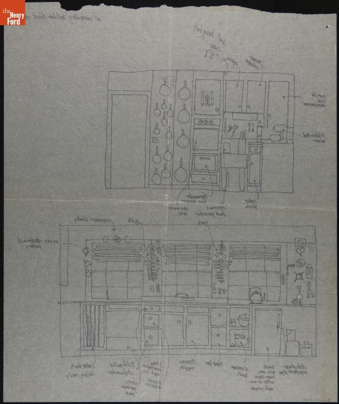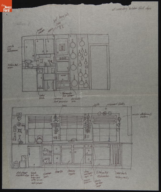 Ink and Pencil Sketch by Jean Beirise of a Wall in Julia Child's Kitchen, 1977
