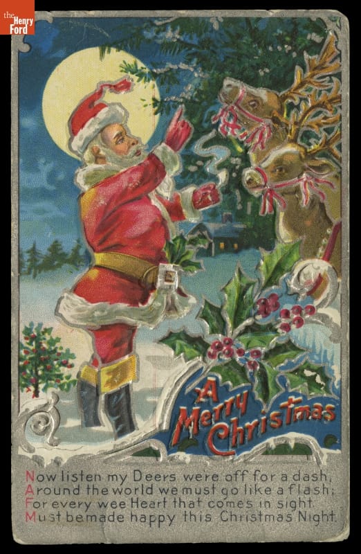 Christmas Greeting Postcard, Santa with Reindeer, "Now Listen My Deers We're Off for a Dash," 1907-1910
