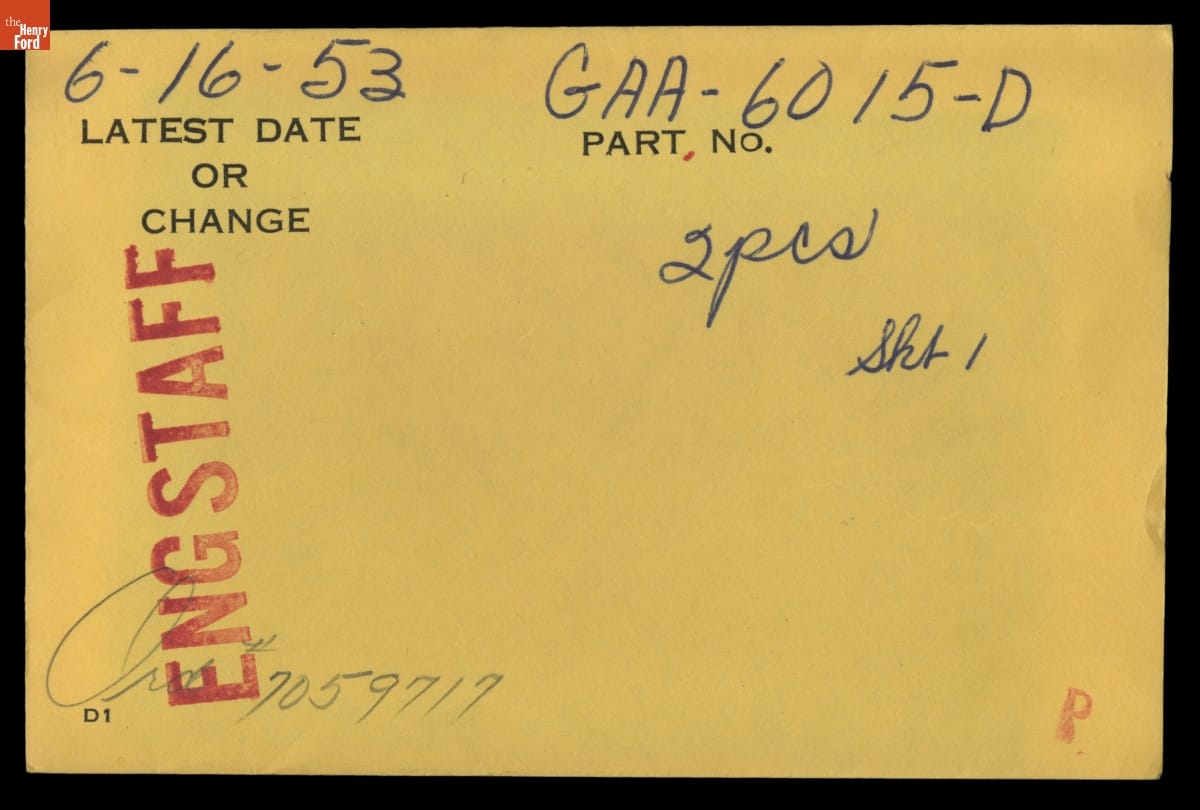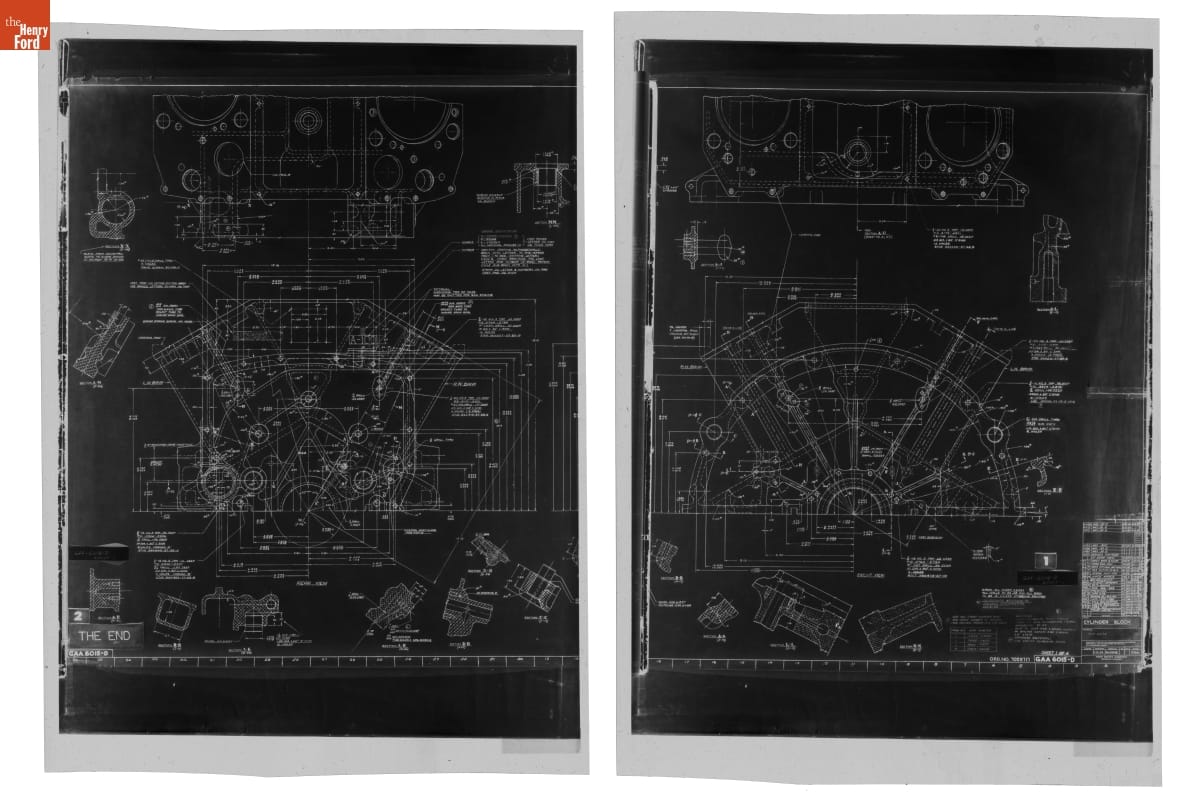 The Ford Motor Company created over a million parts drawings from 1903 to 1957. Many of these drawings specify engineering requirements for the components of Ford-made vehicles--including automobiles, trucks, tractors, military vehicles and Tri-motor airplanes. Others document assembly components, stages of casting and forging, or experimental designs. Beginning in the 1940s, Ford transferred the drawings to microfilm.