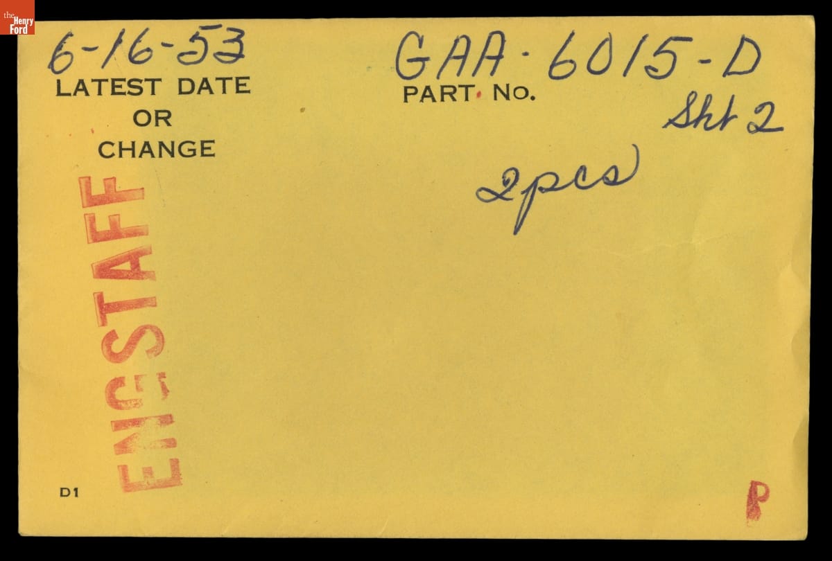 The Ford Motor Company created over a million parts drawings from 1903 to 1957. Many of these drawings specify engineering requirements for the components of Ford-made vehicles--including automobiles, trucks, tractors, military vehicles and Tri-motor airplanes. Others document assembly components, stages of casting and forging, or experimental designs. Beginning in the 1940s, Ford transferred the drawings to microfilm.