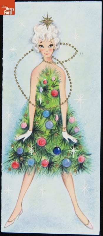 By the 1960s, Christmas cards offered a greater variety of seasonal images. Rather than a traditional Santa, Christmas tree, angel, poinsettia, or the Nativity, this card sported a woman dressed in a pine tree decorated with 1960s trendy-colored ornaments. A garland necklace and star hair ornament are her accessories. Christmas decorations as fashion.