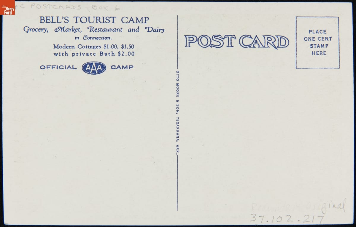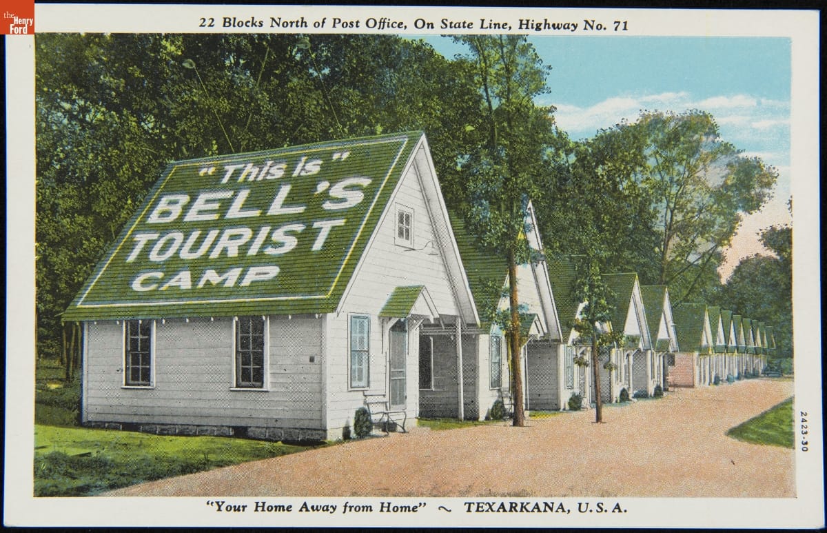 Motorists weary of roughing it in tents found that homey little cabins offered a convenient, economical alternative. By the 1930s, tourist cabins were popping up everywhere. Bell's Tourist Camp in Texarkana, Arkansas, offered a selection of "modern cottages," along with a restaurant and market.