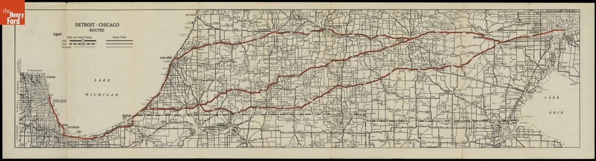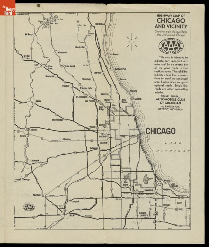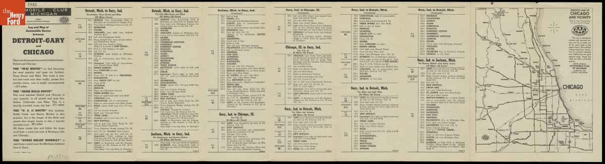 The Automobile Club of Michigan published this map in 1942 to help guide motorists between Detroit and Gary, Indiana, and then from Gary to Chicago. Each of the three suggested routes offered its own advantages and attractions. The "U.S. 12 Route" most closely parallels modern Interstate 94, which became the principal route between Detroit and Chicago when completed in 1972.